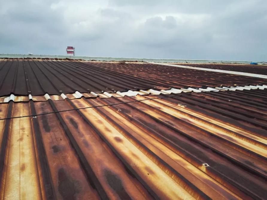 上圖是某企業(yè)光伏電站屋頂實(shí)拍,從圖中我們可以看到廠房屋頂已經(jīng)被嚴(yán)重腐蝕,呈現(xiàn)鐵銹色,因長時間雨水沖刷,腐蝕性環(huán)境等因素,屋檐、角落被腐蝕的情況尤為嚴(yán)重,甚至暴露出建筑內(nèi)部結(jié)構(gòu),用手輕輕用力就能掰彎掰斷,根本無法起到保護(hù)作用,造成嚴(yán)重的安全隱患。