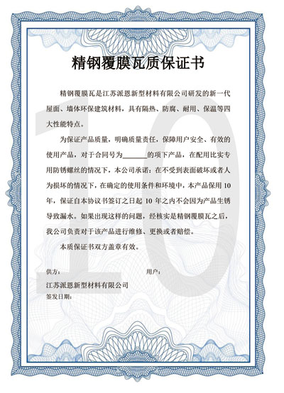 經常有客戶問我:你們精鋼防腐瓦真的可以使用10年以上嗎?在此,我可以鄭重地告訴大家,我們精鋼防腐瓦在北京國家建材實驗室是做過耐候性測試的,做了3000個小時,確??梢杂?0年。其實10年是我們的保守估計,正??赡?5年都沒有問題的。如果您有需要,我們可以之后傳證書進行相關證明。另外我們可以簽訂質保協議。